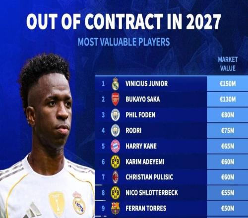 德转列合同2027年到期球员身价榜:维尼修斯、萨卡、福登前三