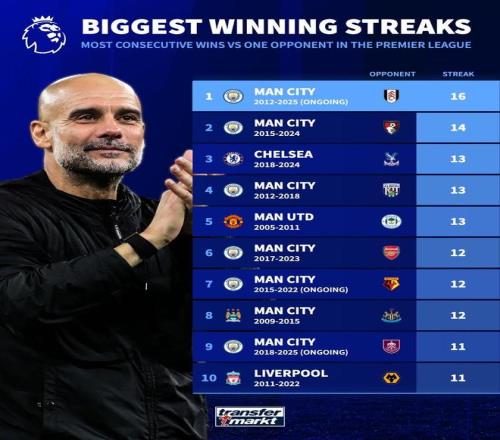 德国转会市场网站列出了英超历史对阵同一球队最长连胜排行榜,曼城对富勒姆16连胜居首,排名第二的是曼城对伯恩茅斯14连胜。